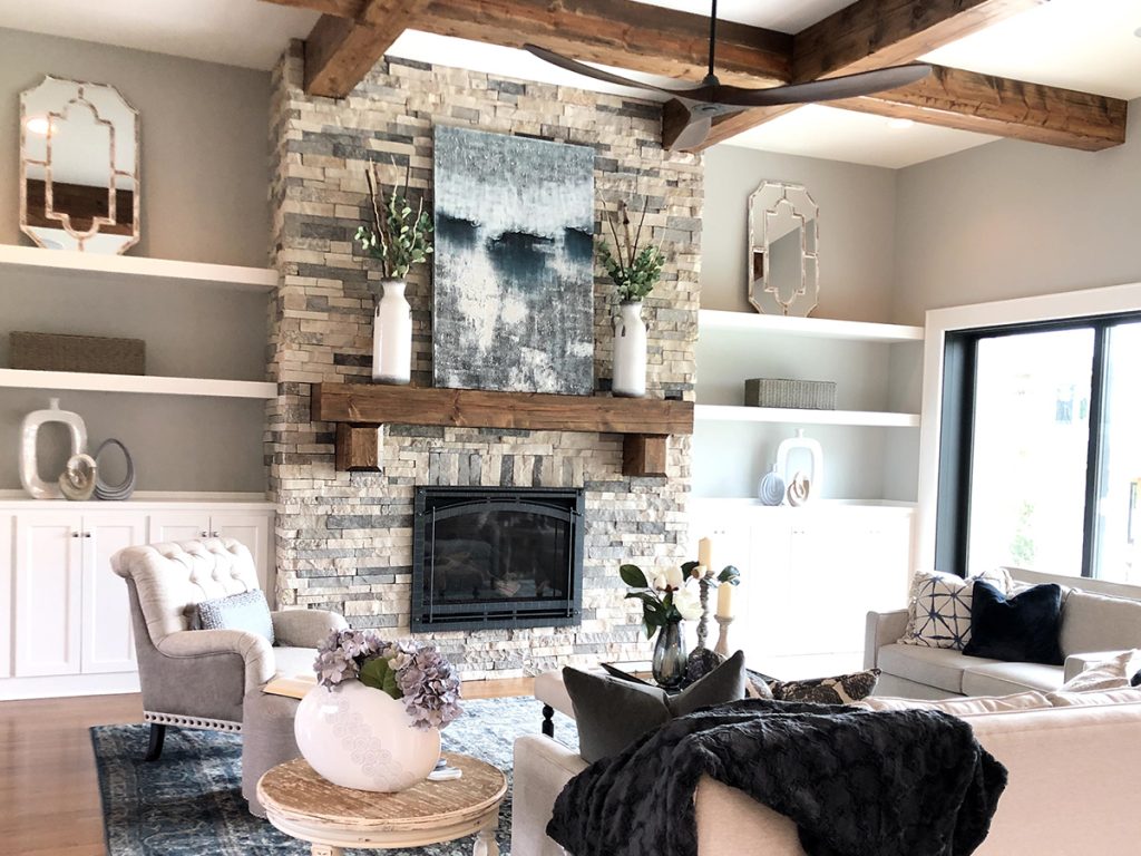 One of the most popular uses for wood beams is to separate lights. Adding spaces between your light fixtures can make a room feel more ample and open, while giving you an opportunity to showcase your wooden trusses or faux wood beams.